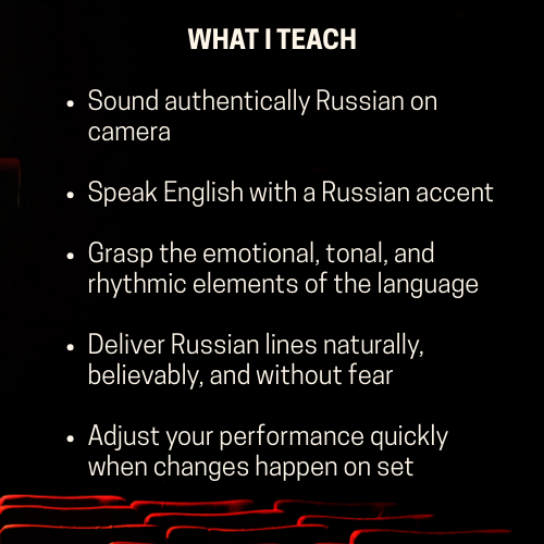 I specialize in helping performers speak Russian and Ukrainian on screen with natural, believable delivery — no overload, no unnecessary theory, just practical tools that work.