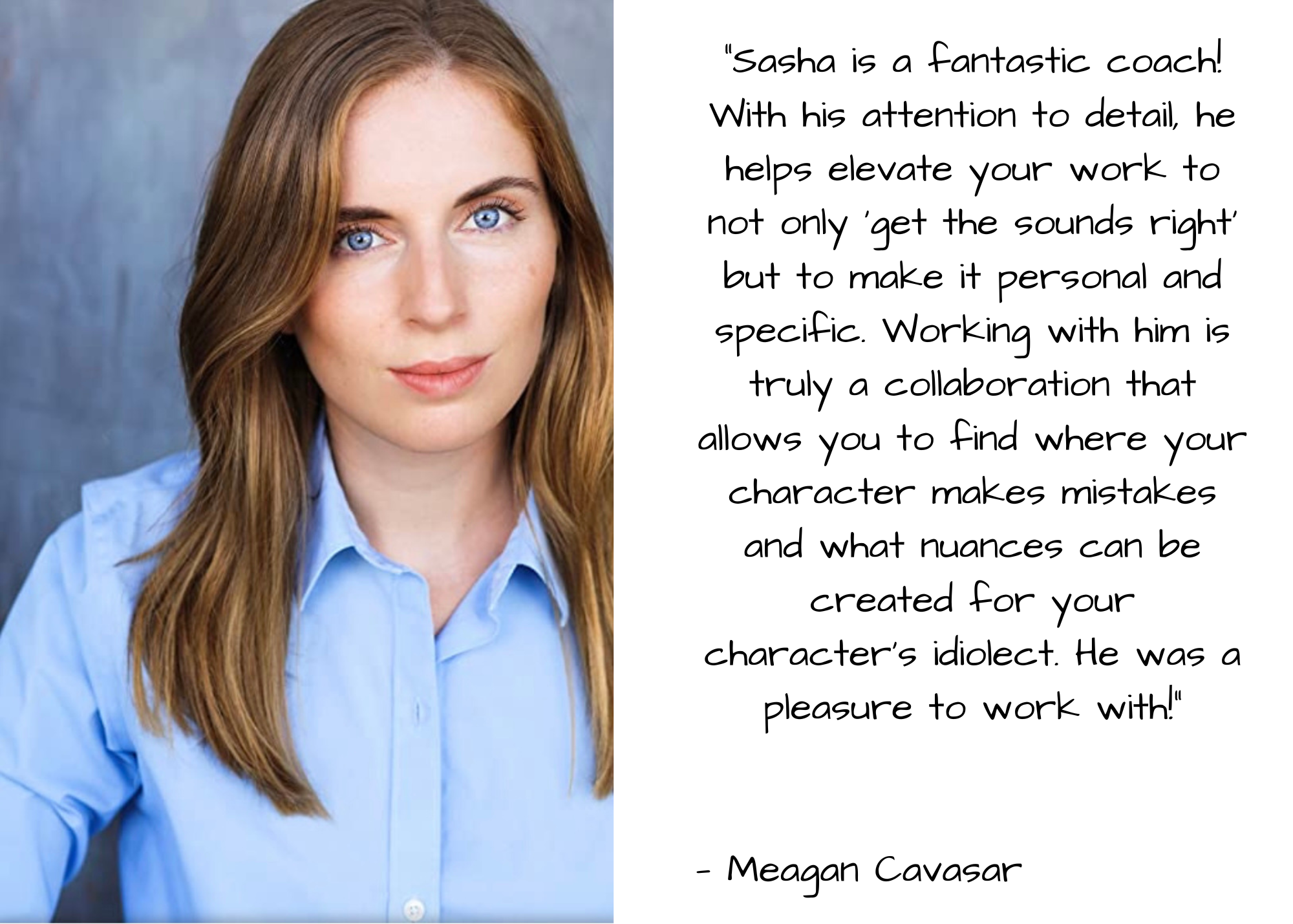 "Sasha is a fantastic coach! With his attention to detail, he helps elevate your work to not only 'get the sounds right' but to make it personal and specific. Working with him is truly a collaboration that allows you to find where your character makes mistakes and what nuances can be created for your character's idiolect. He was a pleasure to work with!"