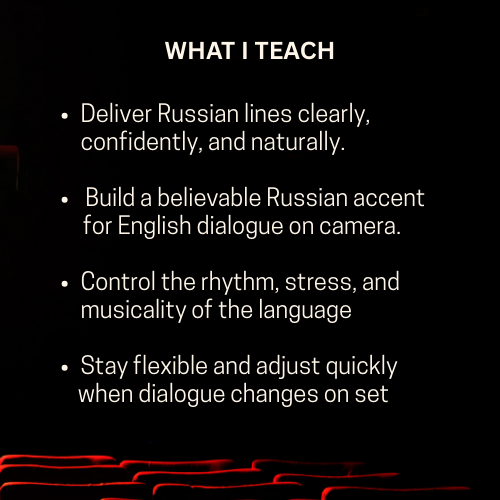 I work with performers to build authentic Russian accents for film and television, and to prepare Russian dialogue for the realities of production — through a clear, practical method built for actors.