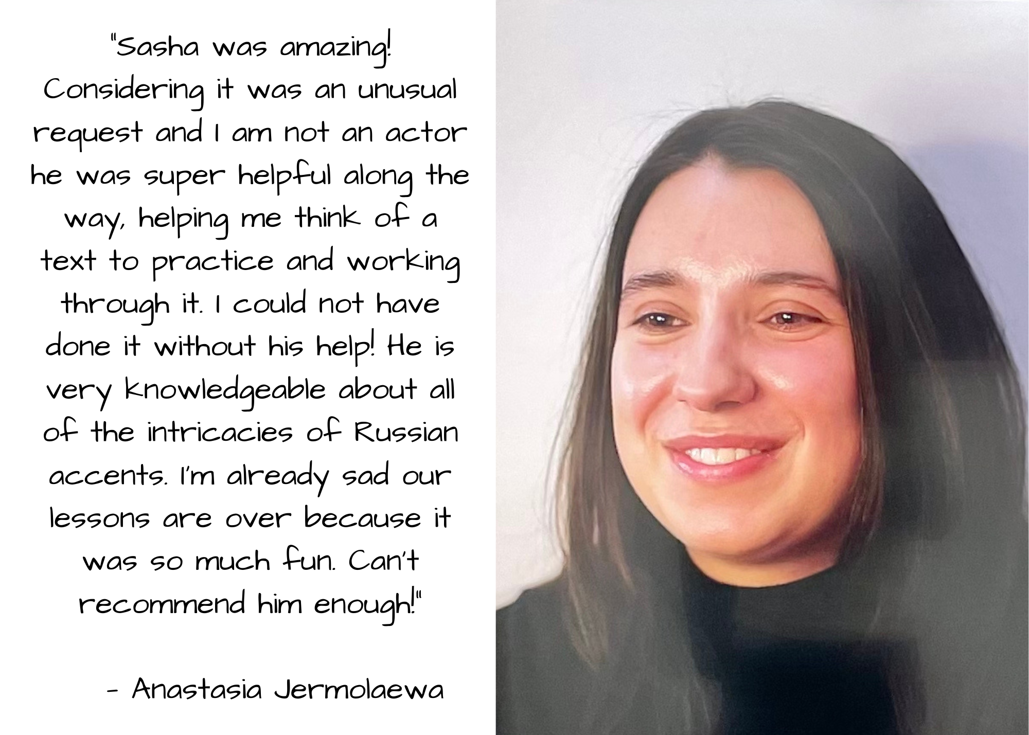 “Sasha was amazing! Considering it was an unusual request and I am not an actor he was super helpful along the way, helping me think of a text to practice and working through it. I could not have done it without his help! He is very knowledgeable about all of the intricacies of Russian accents. I’m already sad our lessons are over because it was so much fun. Can’t recommend him enough! “